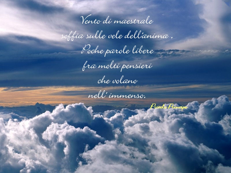 Parole volano leggere librandosi fra nubi passeggere. In alto volano a cercare le mille ragioni per amare. Parole...salgono a scrutare il cielo colorato per tornare poi lievi dentro ai cuori e sfumare così dolci dolori.TristeImmagine: