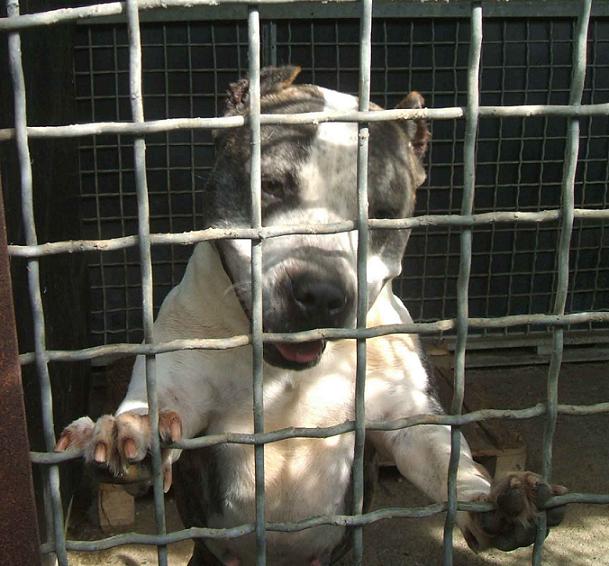 io sono ALAN, sono un meticcio di pit-bull, bianco e grigio tigrato, nato nel 2005, maschio.